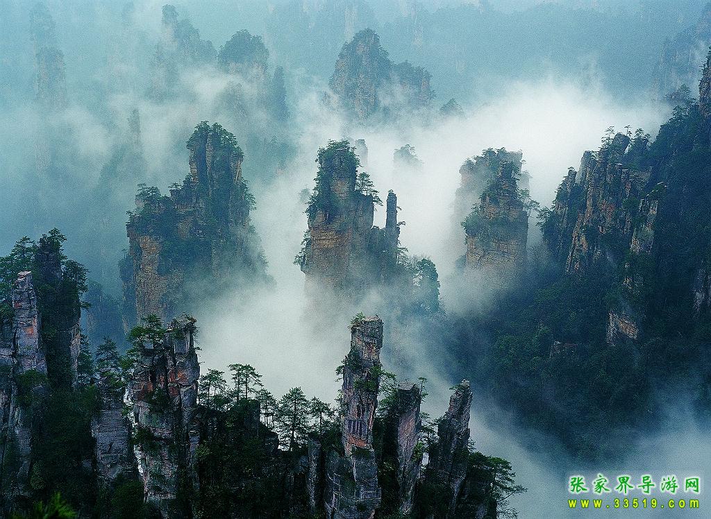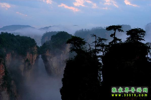在“后花園”的對面,是一座巍峨的山巒,山上古木參天,遮天蔽日。森林中常有野山羊出沒,夜深人靜之際,常能聽到野羊羔“咩洋”地叫聲,因此被稱作“羊寨”。民國時期,此地曾為土匪占領(lǐng),直到現(xiàn)地,山上還殘留有卡門、暗堡、斷壕、屋場、水井、碓臼、磨坊等殘跡。粗大的松樹上還留有土匪當(dāng)年留下的“V”字型標(biāo)志。站在“山寨”上,舉目眺望,可看見金鞭溪全景,只見一條美麗的溪水從數(shù)百座石林中緩緩穿過,顯得是那樣的幽靜、和諧。從“后花園”向前步行約100米,便是袁家界又一處絕世奇觀——迷魂臺,走上迷魂臺,只見上百座山巒拔地而起,峰涌而至,它們姿態(tài)萬千、氣勢非凡;有的似“天狗望月”,有的像“海螺出水”;有的像“將軍列隊(duì)”,有的如“一柱擎天”。幾道山坳和屏障將這些山巒有序的分開,使這些石峰更顯得層次分明,井然有序,在萬道霞光的點(diǎn)綴下,顯得蔚為壯觀,不同凡響。這更像是一幅畫家筆下的水墨丹青,“迷魂臺”攬勝,真宛如仙境神游啊。