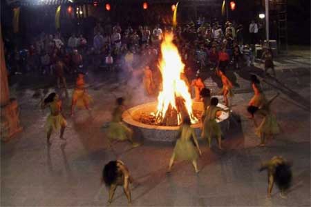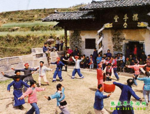 “擺手”,土家人稱為“社巴”,正月初三至十七日這段時(shí)間稱為“社巴日”或“社巴節(jié)”,歷史上,土家人在各村寨都建有“擺手堂”和神廟。在神廟內(nèi),還供有土家族的祖先八部大王或土司王神像.每到“社巴節(jié)日”都有歌舞活動(dòng)。這種調(diào)年擺手舞叫“社巴”也有叫“調(diào)年”的,有強(qiáng)烈的戲劇性,有故事情節(jié),還有人物,它由拔普(公公)、拔帕(婆婆)、阿達(dá)與阿柯等男女老少集體在而舞。 擺手舞的形式一般是這樣的:在擺手堂的中央高掛龍旗,四方點(diǎn)燈,由金童玉女給土家人用銅盆洗手,再從香火山取來神火,然后在龍旗下點(diǎn)燃3堆篝火。隨著3聲炮響,先由梯碼法師(巫師)手舉八寶銅鈴作前導(dǎo),大家跟著翩翩起舞,徹夜不眠。 擺手舞的主要?jiǎng)幼髟谧呗放c彎腰時(shí),擺動(dòng)同邊手。擺的形式,一般分單擺、雙擺、環(huán)擺、花擺、插擺與擺七步等,因?yàn)閿[得多,所以稱“擺手舞”。擺手舞,還分“小擺手”與“大擺手”。“小擺手”的規(guī)模的較小,形式與內(nèi)容主要是模擬挖地、播種、薅包谷草、摘包谷或者是在田里插秧、扮谷、曬谷等多項(xiàng)農(nóng)事活動(dòng),也有表現(xiàn)打獵或漁獵活動(dòng)的。有些地方的“小擺手”舞也有表現(xiàn)吹木葉、接新娘等生活內(nèi)容的。 “大擺手”,主要是規(guī)模大,參加的單位往往是幾個(gè)甚至幾十個(gè)村寨,參加的人數(shù)也幾千人或上萬甚于幾十萬人的。“大擺手”的內(nèi)容比“小擺手”豐富,除表現(xiàn)農(nóng)事活動(dòng)和土家人生活以外,還有表現(xiàn)軍事活動(dòng)的。“大擺手”的形式,一般先由領(lǐng)頭人手執(zhí)五彩布條做的“柳巾”指揮,接著是“梯碼”隊(duì)(由巫師組成)和鼓樂隊(duì),同時(shí),男女?dāng)[手舞隊(duì)也一起入場。這其中還有特別引人注目的披甲小旗隊(duì)(他們身披打花鋪蓋象征盔甲)。這支披甲小旗隊(duì)手執(zhí)小花旗,顏色有紅有綠,有黃有藍(lán),色彩艷麗,五彩繽紛。他們表演的內(nèi)容與形式,主要是反映人類起源,先民軍事活動(dòng)、部落搬遷等,舞蹈動(dòng)作難度較大,為廣大土家人所喜愛。