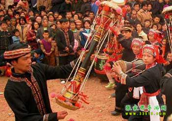 然而,好景不長,“長毛鬼”看到人間生活富裕,便起了嫉恨之心。他唆使雷公趕走了龍,從此,苗家人的生活便苦了,年年天干,莊嫁旱死,人畜連喝水都十分困難。沒有辦法,他們只好拄著拐杖上山求雨,求雨不成,唯有接龍回來才行。于是,苗族人民想龍、盼龍,每年都于二月二、六月六或九月九舉行“接龍”儀式,載歌載舞。這就是苗族“接龍舞”的來歷。 “接龍舞”首先由“龍師”手捧瓷碗作前導(dǎo),接著是數(shù)名代勾(男童)分不兩隊(duì),手持紅綠兩色條旗,走成龍形,還有紅衣老司(巫司),手舞司刀,揮動(dòng)柳旗,一路上驅(qū)趕“長毛鬼”,隨后而來的是一群群的瑪汝黛帕(年輕美麗的姑娘,一般一群分為八人、二十八人、四十八人與八十八人不等),穿著艷麗的花邊衣,花邊裙,花邊鞋,還打著花邊傘,拿著花邊手帕,頭上盤發(fā)辮,戴銀飾,胸前配戴銀質(zhì)“長命鎖”,翩翩起舞,旋轉(zhuǎn)花傘,接龍降雨。他們的舞蹈動(dòng)作有:敬天神、盼龍回、龍翻身、龍穿衣、龍搶寶,然后就是接龍入龍門,拋粑粑。這時(shí)候,苗家的桐皮長號(hào)、包谷銅鑼、嗩吶、牛角、大鼓等各種樂器都一齊奏響,還伴隨著吹木葉、唱苗歌等等,是最熱鬧的時(shí)候,表示龍接回來了,苗家的生活又好了。它反映了苗族人民對(duì)未來幸福的憧憬與追求。