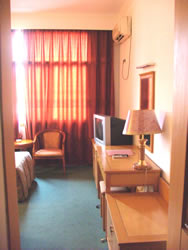 酒店簡(jiǎn)介:賓館擁有豪華標(biāo)準(zhǔn)間間,普通標(biāo)間、彩電、空調(diào)、高檔地毯、電話、整體淋浴房等,二十四小時(shí)供應(yīng)熱水,餐廳、宴會(huì)廳能容納180人同時(shí)就餐,卡拉宋、美容美發(fā)、桑拿按摩、旅游車隊(duì)、商務(wù)部、票務(wù)中心等配套服務(wù)設(shè)施一應(yīng)俱全,是住宿、餐飲、旅游度假、休閑娛樂(lè)的理想場(chǎng)所。 地 址: