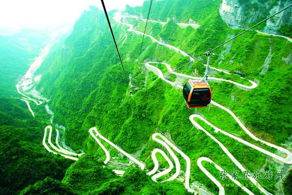 考慮到索道運(yùn)行時(shí)間較長(zhǎng),高溫時(shí)游客們需要通風(fēng),每個(gè)轎廂專門(mén)設(shè)計(jì)了兩個(gè)通風(fēng)窗,以形成空氣的對(duì)流,這人性化設(shè)計(jì)在國(guó)內(nèi)是唯一的。索道鋼繩則來(lái)自于法國(guó),直徑50.1mm,每米重達(dá)10kg,確保游客安全無(wú)虞。 天門(mén)山索道最大的亮點(diǎn)就是它的爬坡面支架的設(shè)計(jì) ,這個(gè)支架共有壓索輪96個(gè),托索輪16個(gè),它綜合了現(xiàn)代物理學(xué)、現(xiàn)代工程學(xué)、現(xiàn)代制造業(yè)中最先進(jìn)的理論和成果,應(yīng)用了世界最先進(jìn)的索道技術(shù),從而使這段索道總給人一種蕩氣回腸、氣勢(shì)沖天的感覺(jué)。 天門(mén)山索道以張家界市中心的城市花園為起點(diǎn),直達(dá)天門(mén)山頂?shù)脑伎罩谢▓@,猶如一道彩虹飛渡“人間” “天上”,又象一條巨龍騰翔素云蒼穹,依山籍壁,拔地沖天,蕩氣回腸,恢宏壯觀,成為天門(mén)山旅游風(fēng)景區(qū)“四大奇觀”之一,為張家界這一世界級(jí)風(fēng)景名勝區(qū)又添絕世奇景。