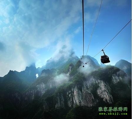 ![]() 天門山索道全長7455米,水平高差1279米,是世界最長的高山客運(yùn)索道。索道修建耗時2年,耗資2.5億人民幣,其中一段有著高達(dá)38°的爬坡角設(shè)計在國內(nèi)乃至世界都極為罕見。整條索道以張家界市中心的城市花園為起點,直達(dá)天門山頂?shù)脑伎罩谢▓@,猶如一道彩虹飛渡人間天上,又似一條巨龍騰翔素云蒼穹,依山籍壁,恢宏壯觀。索道沿途經(jīng)過現(xiàn)代城市風(fēng)光,秀美田園風(fēng)光以及雄奇高山風(fēng)光,堪稱世界第一空中移動觀景長廊。